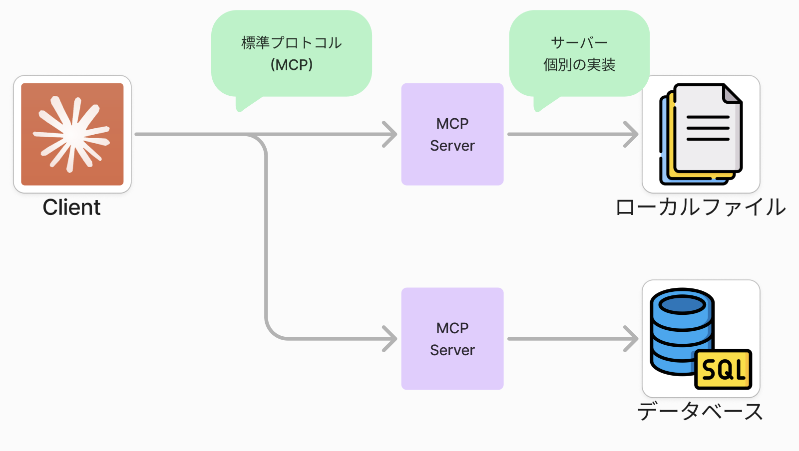 - ローカルMCPサーバー:実際の機能を提供するプログラム
